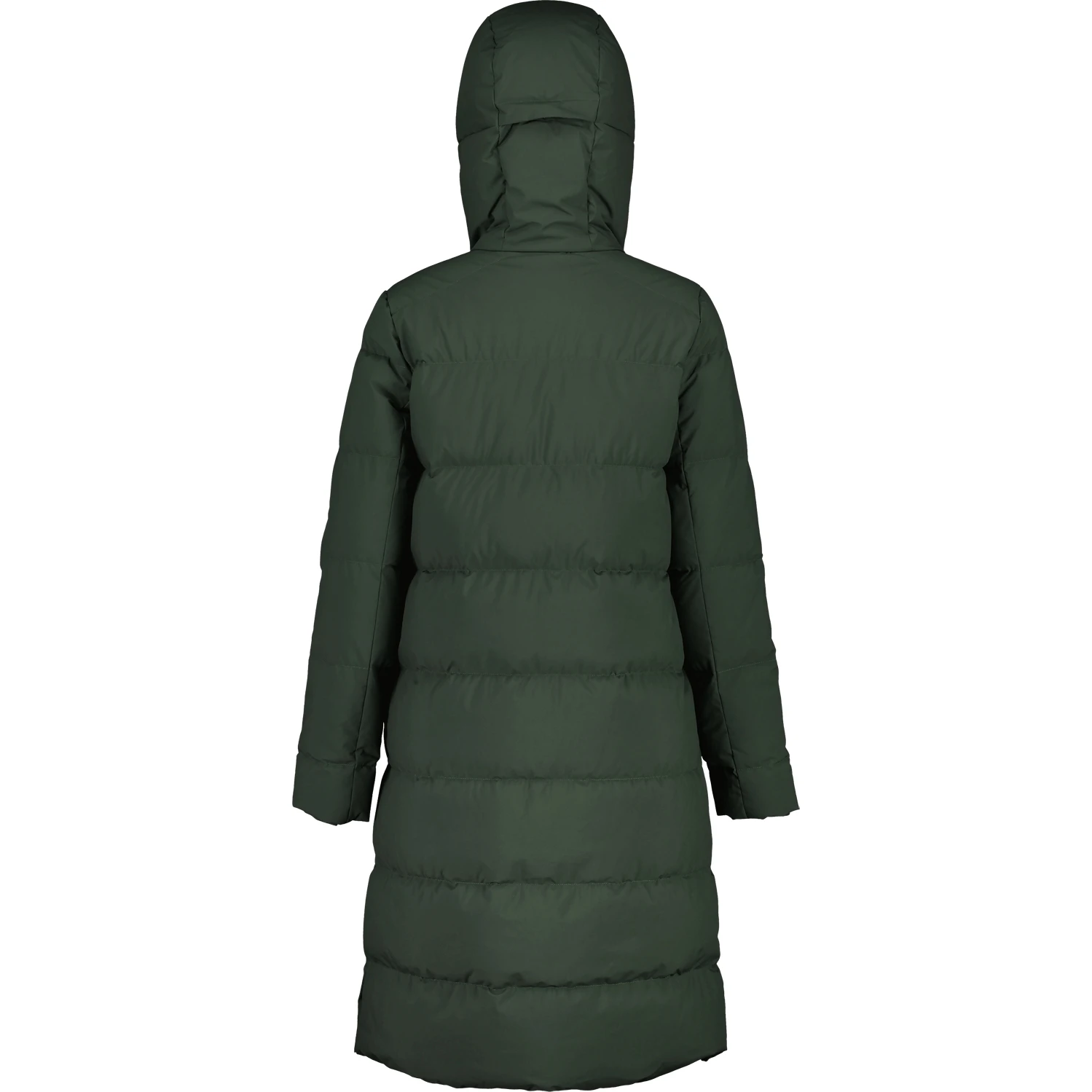 Sehr warmer, lang geschnittener Mantel mit Füllung aus recycelten Daunen. Das Stormshell-Außenmaterial ist wasserabweisend, winddicht und besitzt eine PFC-freie, dauerhaft wasser- und schmutzabweisende Ausrüstung. Große Kapuze, Zwei-Wege-Reißverschluss, seitliche Schlitze mit Druckknöpfen für mehr Bewegungsfreiheit, zwei seitliche Reißverschluss-Taschen, darüber zwei Taschen mit Druckknopf-Patten. Jacron Maloja Logo-Label links über der Tasche.