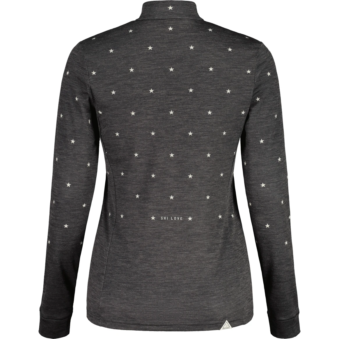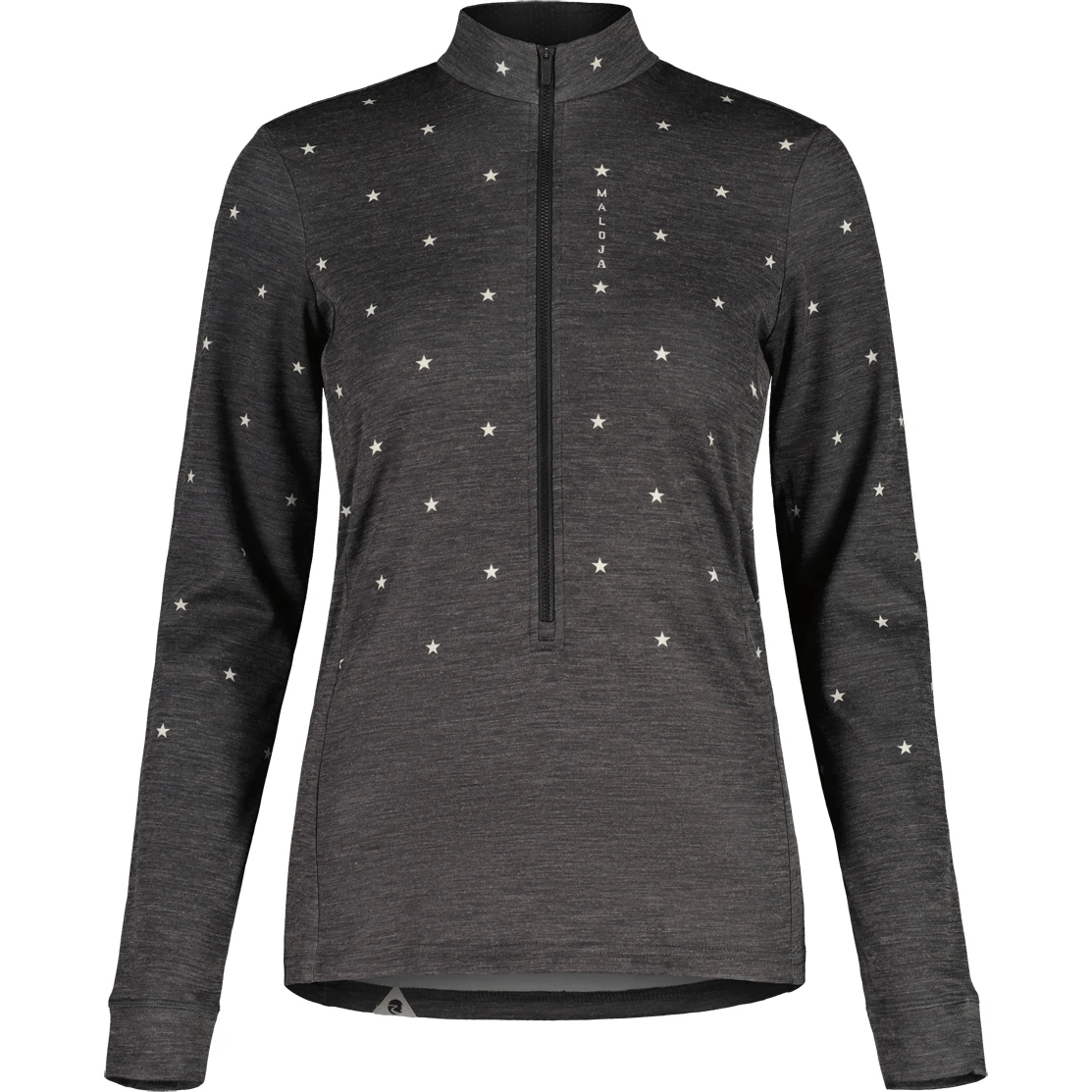 Das elastische, schnell trocknende Thermopile Merino-Material mit langem Front-Zipper ist die ideale Zwischenschicht für alle Outdoor-Abenteuer. Stern-Prints im oberen Bereich, Maloja-Schriftzug links neben dem Zipper und am Rücken.