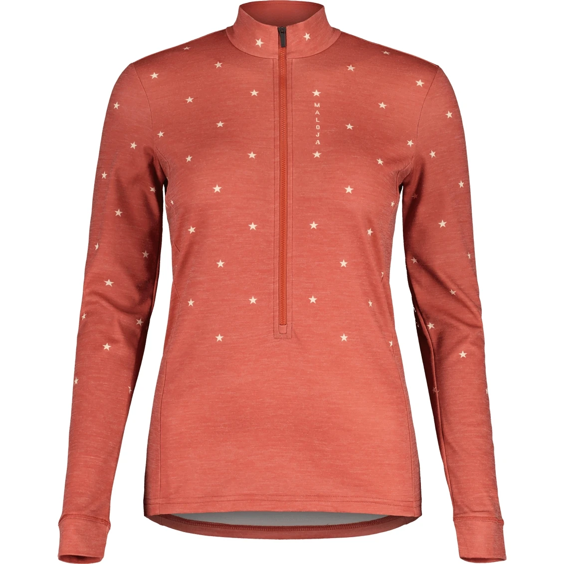 Das elastische, schnell trocknende Thermopile Merino-Material ist die ideale Zwischenschicht für alle Outdoor-Abenteuer. Grafischer Maloja-Schriftzug neben dem Front-Reißverschluss und Happy Mountain-Weblabel.