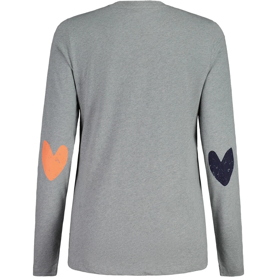 Locker geschnittenes Longsleeve mit überschnittenen Ärmeln aus fair und biologisch hergestellter Baumwolle, online trackbar nach bioRe-Standard. Mit großem Retro-Print auf der Brust, Herzdruck-Print an den Ellbogen.
