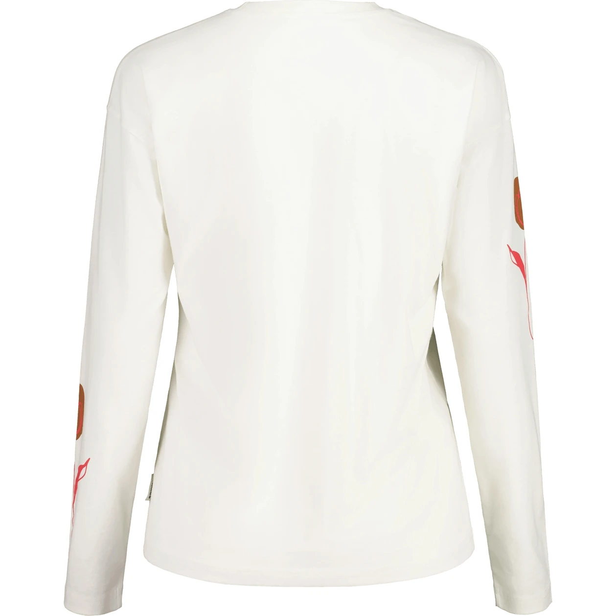 Locker geschnittenes Longsleeve mit überschnittenen Ärmeln aus fair und biologisch hergestellter Baumwolle, online trackbar nach bioRe-Standard. Asymmetrisch platzierte Alpenblumen-Prints auf den Ärmeln.