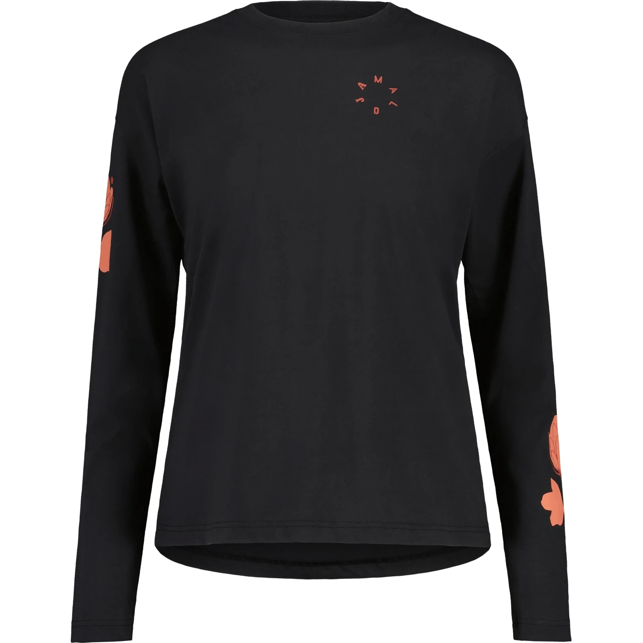 Locker geschnittenes Longsleeve mit überschnittenen Ärmeln aus fair und biologisch hergestellter Baumwolle, online trackbar nach bioRe-Standard. Asymmetrisch platzierte Alpenblumen-Prints auf den Ärmeln.