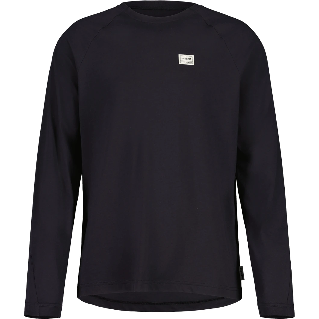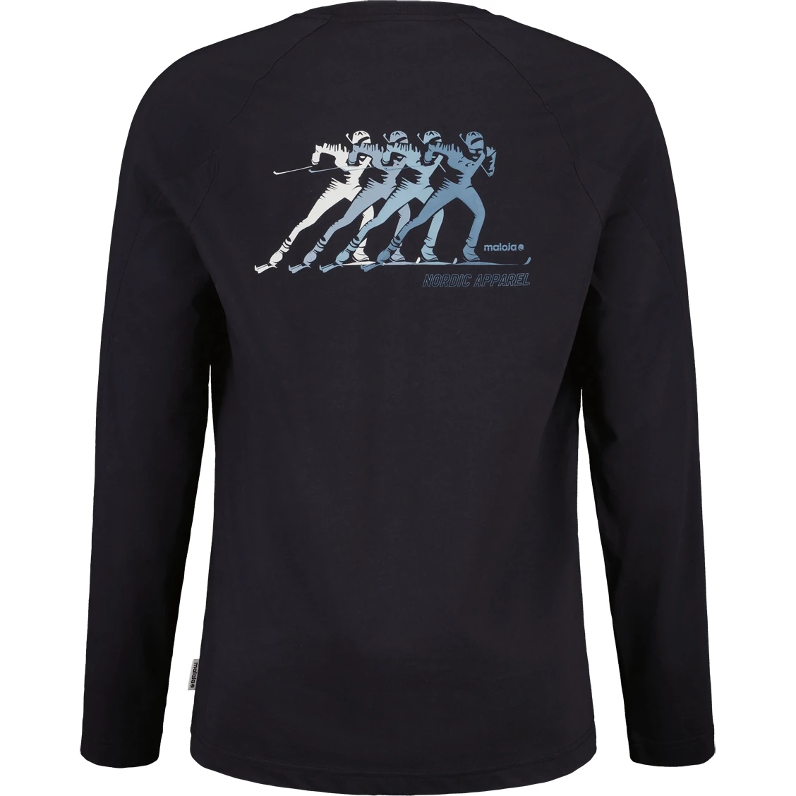 Langarmshirt aus Bio-Baumwolle mit modernem Design: Raglan-Ärmel und angesetzte Rippbündchen am Kragen und den Ärmeln. Großer Langlauf-Print auf dem Rücken, Maloja-Patch auf der Brust.