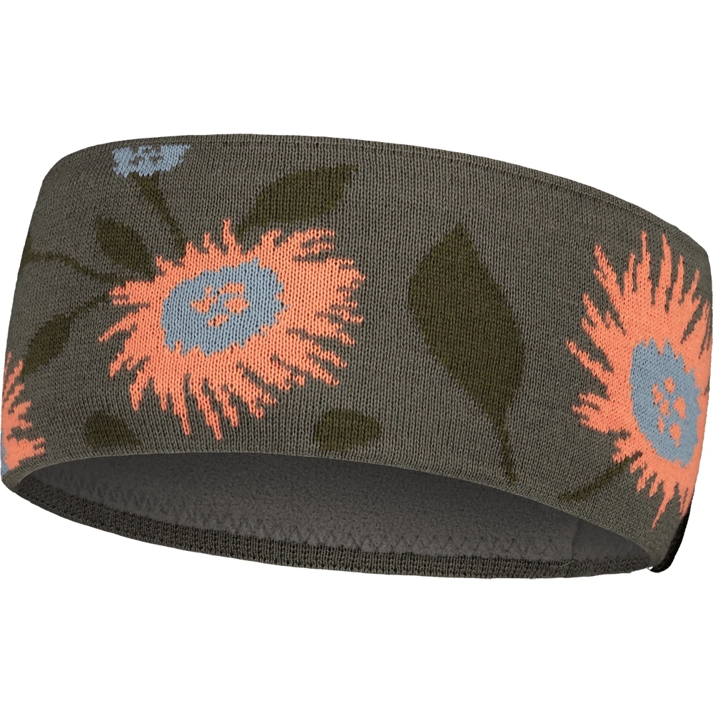 Warmes, innen fleecegefüttertes Stirnband aus Woll-Mix mit eingestricktem Blumen-Muster. Vertikales Maloja-Label am Rand.