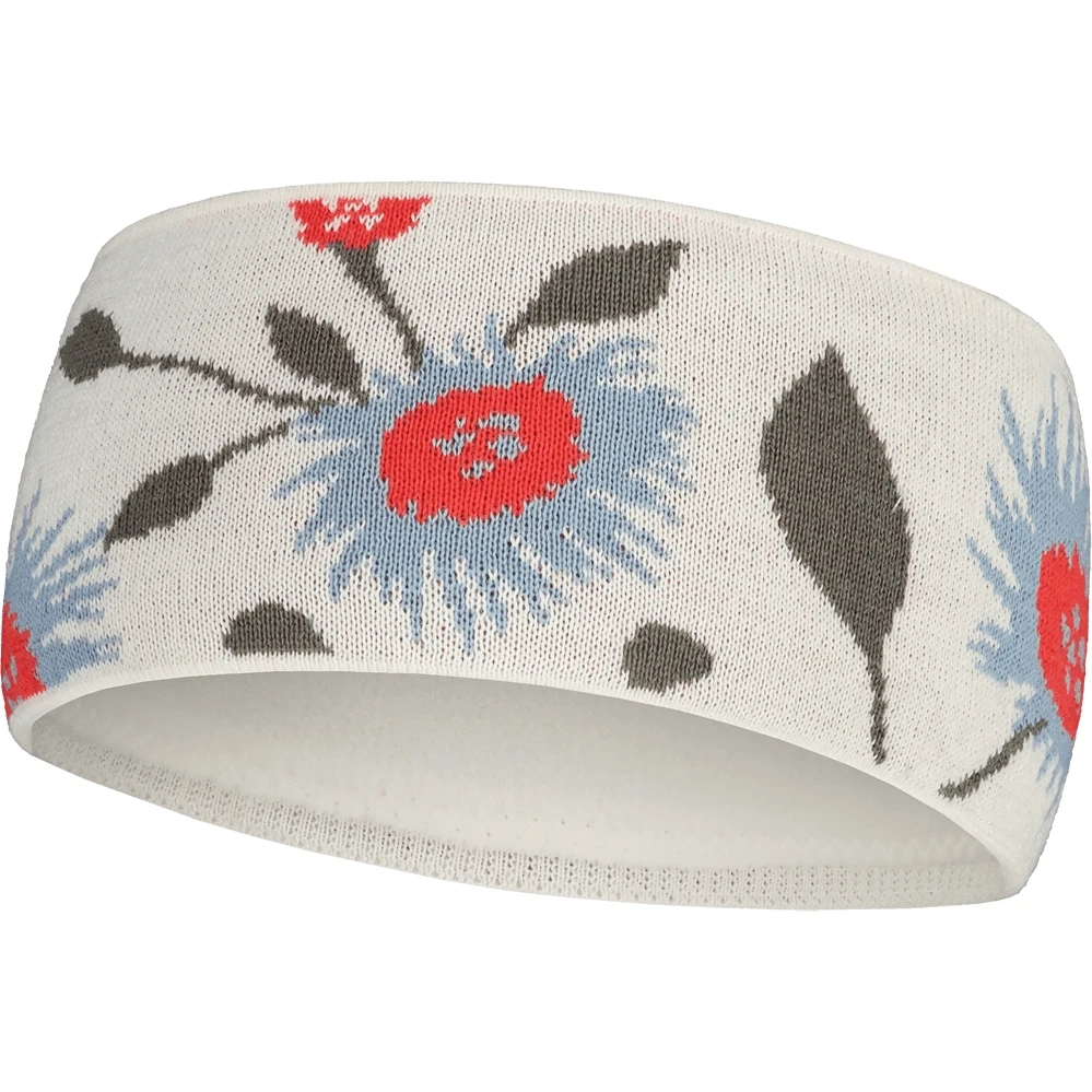 Warmes, innen fleecegefüttertes Stirnband aus Woll-Mix mit eingestricktem Blumen-Muster. Vertikales Maloja-Label am Rand.